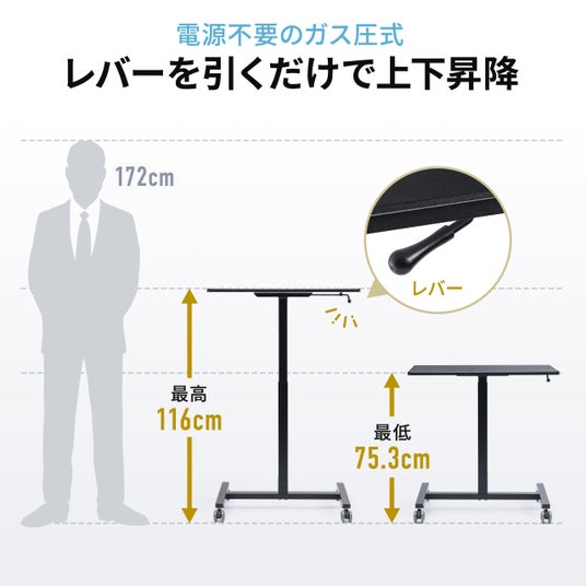 電源不要で上下昇降でき、キャスターもついているため、場所や使い方に囚われずに使うことのできるデスクです!