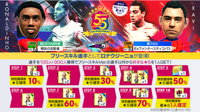 今回は、2つ目のスキルがスキル継承枠になっているフリースキルバージョンの「ロナウジーニョ」も登場!また、★4バージョンの「ロナウジーニョ」、「シャビ」などがもらえるスペシャルログインボーナスも実施します。