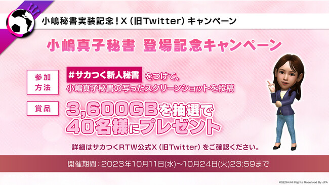 これを記念したSNSキャンペーンを実施します。期間中、「#サカつく新人秘書」をつけて、「小嶋真子秘書」の写ったスクリーンショットをX(旧Twitter)に投稿いただいた方から抽選で40名様に、3,600GBをプレゼントします。奮ってご応募ください!