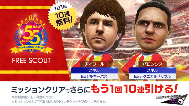 1日1回10連が無料で引ける“5.5Half Anniversary エスパニョーラセレクション'03 FREE SCOUT”と“5.5Half Anniversary エスパニョーラセレクション'03 TICKET SCOUT”を開催! 5.5Half Anniversary エスパニョーラセレクション'03 FREE SCOUT”が最大150連無料となります。さらに、1日1回ミッションクリアで10連分のチケットがもらえ、最大で130連分のチケットが無料で獲得できます。