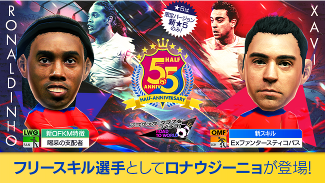 好評配信中のスポーツ育成シミュレーションゲーム『プロサッカークラブをつくろう! ロード・トゥ・ワールド』(以下 サカつくRTW)では、2023年10月11日(水)より、レジェンド「ロナウジーニョ」「シャビ」など、スペイン強豪クラブのスーパースターが新★5選手として登場する“5.5Half Anniversary LEGEND SCOUT”を開催します。