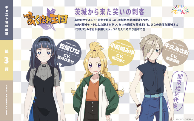 ひなはあくだれ王国でチーム茨城、私は茨城県出身なのですがあまり訛りのない地域に住んでいるので、できるだけ茨城訛りを出せよう茨城弁を勉強したり、櫻川さんや豊田さんにアドバイスをいただきながらアフレコに臨みました。