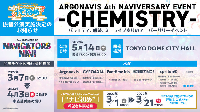 2022年5月14日(土)「ARGONAVIS AAside New Year Event “ナビ初め”」振替公演「ARGONAVIS 4th NAVIVERSARY EVENT -CHEMISTRY-」、2022年5月15日(日)「Fantôme Iris 1st LIVE -C'est la vie!- 振替公演」が両日TOKYO DOME CITY HALLにて開催決定。