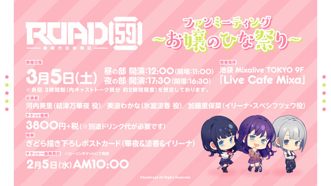 株式会社ブシロード(本社︓東京都中野区 代表取締役社長︓橋本義賢、以下、ブシロード)は、3月5日(土)に、池袋の「Live Cafe Mixa」にて開催いたします、ファンミーティングイベント「~お嬢のひな祭り~」の来場特典詳細や、イベントコラボメニューの詳細発表いたしました。報道関係の皆様におかれましては、ぜひ本情報をお取り扱いいただけますようお願い申し上げます。