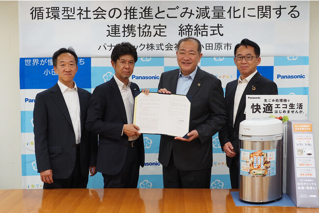 神奈川県小田原市(以下、小田原市)とパナソニック株式会社(以下、パナソニック)は、小田原市における「省資源・循環型社会を目指したまちづくりの実現」に向けた取り組みを推進することで合意し、2023年10月10日に協定を締結しました。この合意に基づき、小田原市において家庭から排出される生ごみ削減を目的とした、生ごみ処理機を用いたごみの減量化に関する事業を実施します。