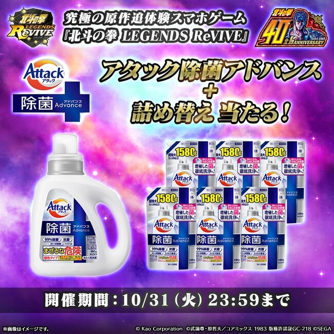 『北斗の拳』40周年&「北斗リバイブ」4周年記念大感謝キャンペーン第五弾! 「北斗リバイブ」公式アカウントと「花王 アタック(お洗濯全般)」公式アカウントをフォローのうえ、対象投稿をリポストした方から抽選で、「アタック除菌アドバンス+詰め替え」セットが10名様に当たります。奮ってご応募ください!