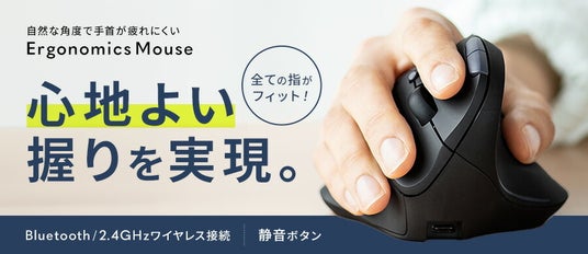 本製品は絶妙なカーブ形状が心地よい握りを実現し、手首に負担がかかりにくいエルゴマウス。