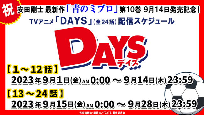 「DAYS」などで知られる、安田剛士先生の「青のミブロ」 最新第10巻が9月14日発売予定!これを記念して、講談社が運営するYouTubeチャンネル「フル☆アニメTV」にて、TVアニメ「DAYS」全24話を無料配信いたします。【第1話~第12話】を本日9月1日から9月14日まで、【第13話~第24話】を9月15日から9月28日までの期間限定配信となりますので、新作「青のミブロ」と一緒にぜひお楽しみください!