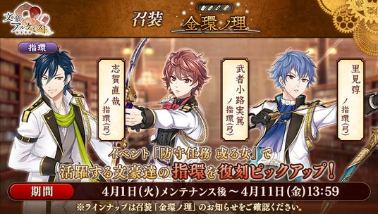 召装『金環ノ理』のラインナップを更新いたしました。この召装では、イベント『防守任務「或る女」』で活躍する「志賀直哉」「武者小路実篤」「里見弴」の指環を一定の確率で入手できます。