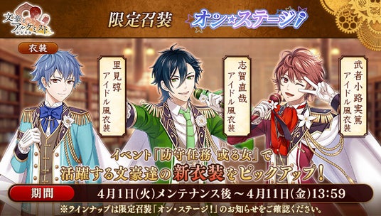 さらに、イベントと同時に開催される限定召装『オン・ステージ!』にて新規追加された「志賀直哉」「武者小路実篤」「里見弴」の〈アイドル風衣装〉を編成すると、得点の獲得率がそれぞれ30%上昇します。