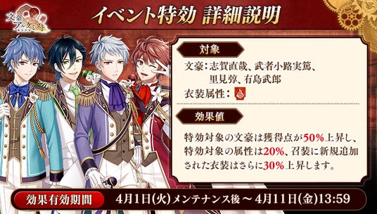期間中「志賀直哉」「武者小路実篤」「里見弴」「有島武郎」の衣装を編成して潜書すると、得点の獲得数がそれぞれ50%上昇します。また、「火」属性の衣装を編成して潜書すると、得点の獲得数がそれぞれ20%上昇します。