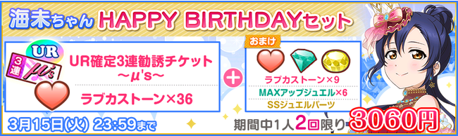株式会社ブシロード(本社:東京都中野区、代表取締役社長:橋本義賢)は、KLab株式会社(本社:東京都港区、代表取締役社長:森田英克)と共同開発いたしましたスマートフォン向けアプリ『ラブライブ!スクールアイドルフェスティバル』(以下、スクフェス) においてμ's園田海未誕生日記念キャンペーンの開催をお知らせいたします。是非貴社の媒体にてお取り扱い頂きますようお願い申し上げます。