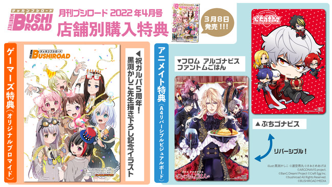 株式会社ブシロード(本社:東京都中野区、代表取締役社長:橋本義賢、以下ブシロード)のグループ会社にあたる株式会社ブシロードメディア(本社:東京都中野区、代表取締役社長:成田耕祐)は『月刊ブシロード』2022年4月号が、本日3月8日(火)に発売することをご案内致します。皆様におかれましては是非誌面・Web記事等で本内容をお取り扱いいただければ幸いに存じます。