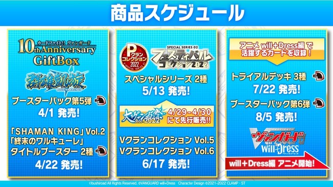 また、アニメ新シーズン(カードファイト!!ヴァンガード will+Dress)で活躍するカードを収録したトライアルデッキ3種と、ブースターパック第6弾の発売が決定!