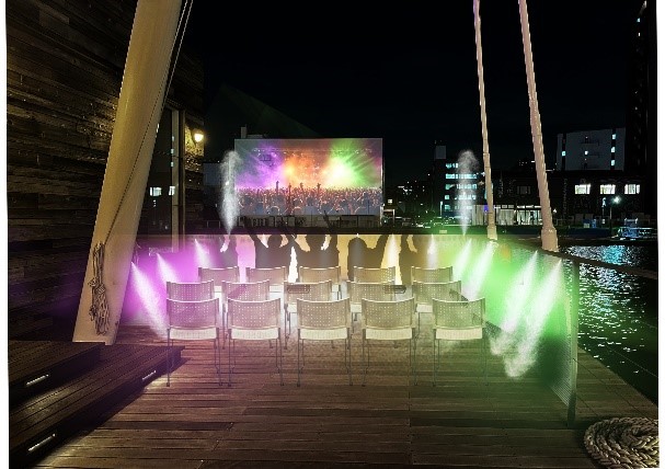 天王洲運河に面したパナソニック東品川ビル壁面を活用した巨大スクリーンに対岸から3万ルーメンの高輝度プロジェクターで映画を投影します。映画のハイライトシーンでは、光とミストの演出で映画の体感を拡張し、屋外の映画鑑賞で水辺の賑わいを創出します。