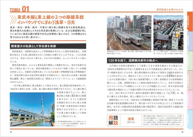 近年、再注力している日光・鬼怒川温泉観光、高架化や複線化の進展、新駅・みなみ寄居駅の開業などの最新の動向から、各路線の解説や会社の歴史、車両解説まで、企業、路線、駅、車両、歴史、魅力の6項目から紹介していきます。