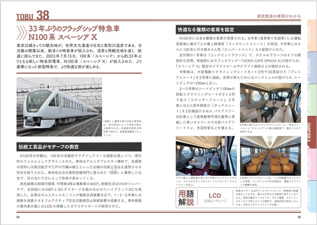 33年ぶりのフラッグシップ特急車 N100系 スペーシア X/分割・併結で柔軟に運用できる特急車 500系 リバティ/東武のフラッグシップトレイン 100系 スペーシア/東武の新たな標準車両 50000系列/野田線用と地下鉄乗り入れ用の次世代車 60000系、70000系列/5扉車もあった地下鉄乗り入れ用18m車 20000系列/私鉄最多の製造数を誇る東武発展期の顔 8000系列・800型・850型/戦後復興期からDRC登場までを支えた特急車 5700系、1700系・1710系/日光アクセスに王手を打った特急車 1700系・1720系DRC/急行「りょうもう」用の1800系と勾配対応に改造した300型・350型/貨物輸送を支えた名脇役たち 蒸気機関車・電気機関車 ほか