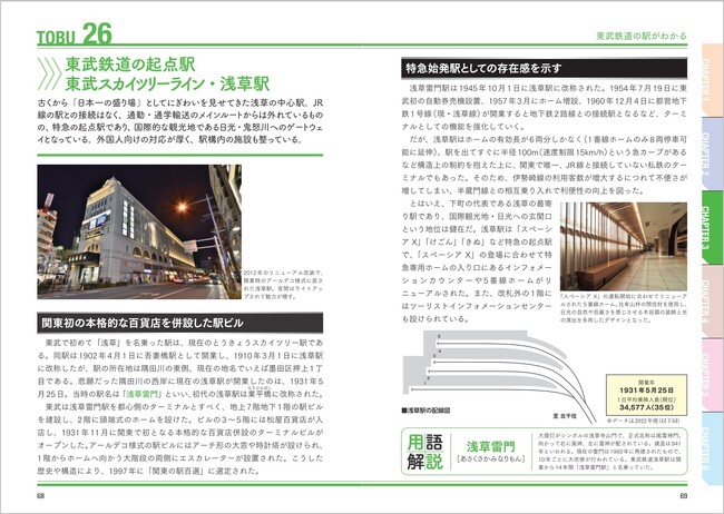 東武鉄道の起点駅 浅草駅/三層構造で膨大な旅客と列車を仕切る 北千住駅/「関東の駅百選」に選ばれた瀟洒な駅舎 館林駅/世界文化遺産へのアクセス駅 東武日光駅/栃木県民の日常生活を支える駅 東武宇都宮駅/常磐線と接続するスイッチバック駅 柏駅/世界屈指の巨大ターミナル 池袋駅 ほか