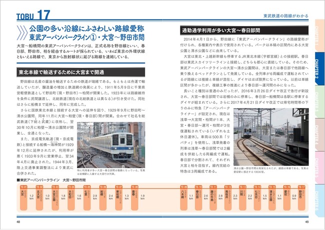 東武鉄道の全12路線を個別に紹介。欄外には駅名、駅ナンバリング、駅間距離を記載しています。
