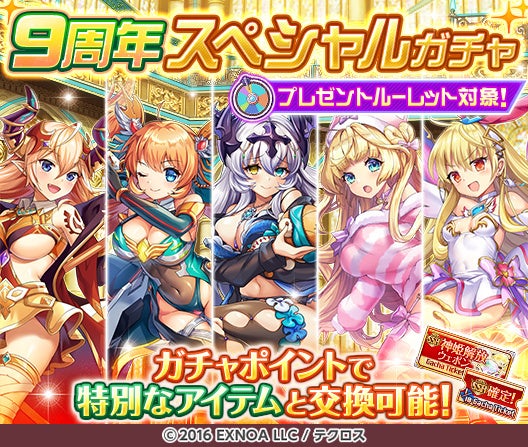 リリース9周年キャンペーンとして、毎日最高100連無料ガチャが当たるプレゼントルーレットを開催します!