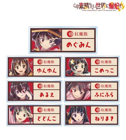 めぐみん、ゆんゆん、こめっこ、あるえ、ふにふら、どどんこ、ねりまきのイラスト、キャラクター名、紅魔族のマークを新たなタッチで魅力的に表現し、アクリルネームプレートに仕上げました。