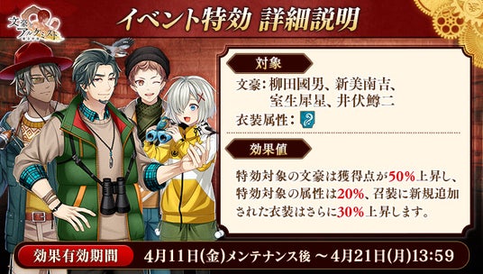 さらに、イベントと同時に開催される限定召装『春麗ら鳥見会』にて新規追加された「新美南吉」「柳田國男」「室生犀星」の〈バードウォッチング衣装〉を編成すると、得点の獲得率がそれぞれ30%上昇します。