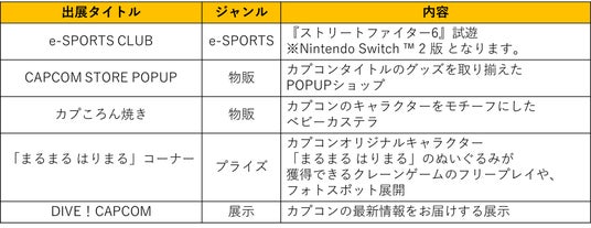 本会場では、eSPORTSゲームの興奮を気軽に体験できる「CAPCOM e-SPORTS CLUB」、カプコンの最新情報を見て・触れて・遊べるエリア「DIVE!CAPCOM」の出展、カプコンのオリジナルキャラクター「まるまる はりまる」のぬいぐるみに挑戦できるクレーンゲームコーナーやフォトブースを出展いたします。