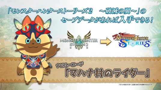 また、『モンスターハンターストーリーズ2 ~破滅の翼~』のセーブデータがあると、『モンスターハンターライズ』でハンター重ね着「ライダーシリーズ」が、『モンスターハンターライズ:サンブレイク』でアイルー重ね着「なりきりナビルー」を入手できます。
