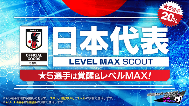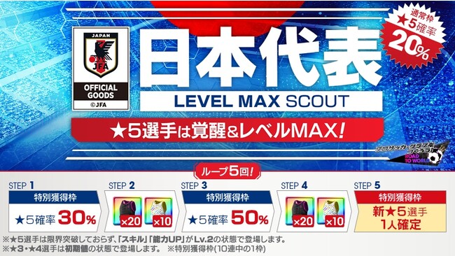 新バージョンの日本代表選手たちが登場する、特典付きの特別なスカウトです。通常枠の★5確率は20%!