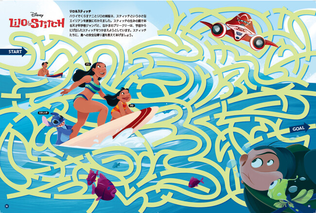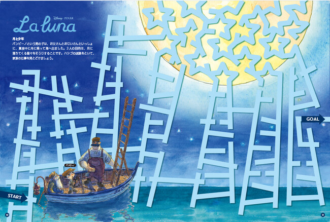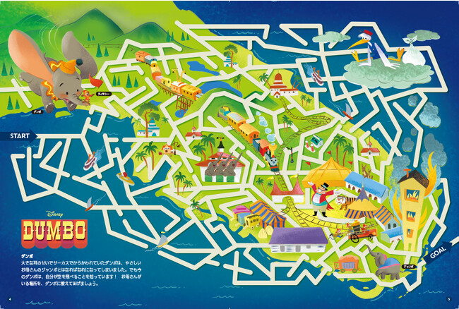 イラストに描かれた素敵な物語の世界を、迷路をたどって旅しましょう。ダンボといっしょに空を飛び、マーリンたちと海をわたって、プーさんと森の仲間たちとパーティーを楽しんでください!