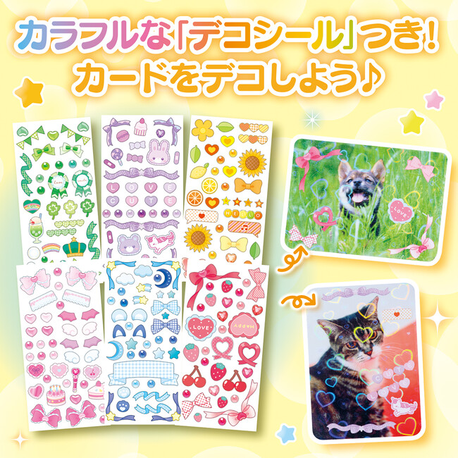 さらに、作った「きらきらカード&シール」を飾れるカラフルな「デコシール」も付いているので、カードをかわいく飾って、自分だけの特別なカードにしましょう。自分の好きな写真や切り抜きなどをホログラム加工したり、デコレーションしたりするのもおすすめです!