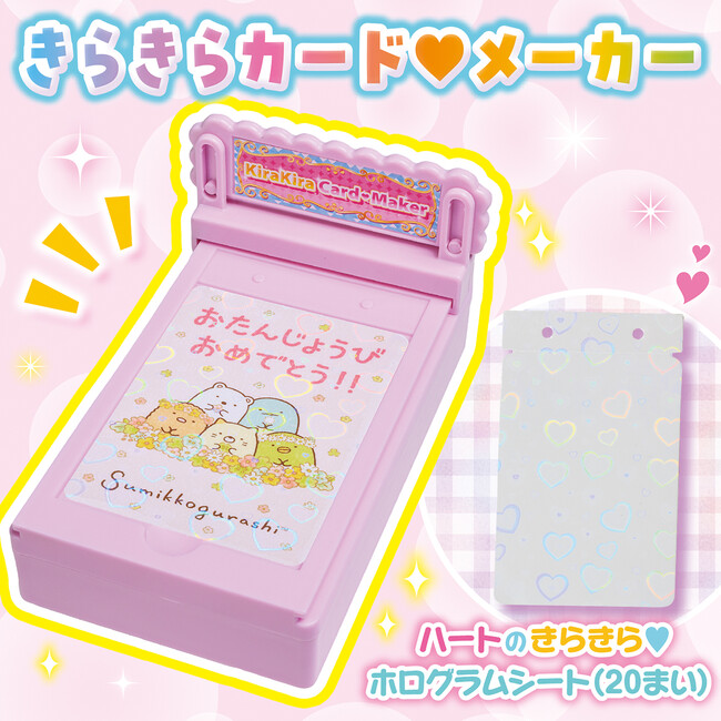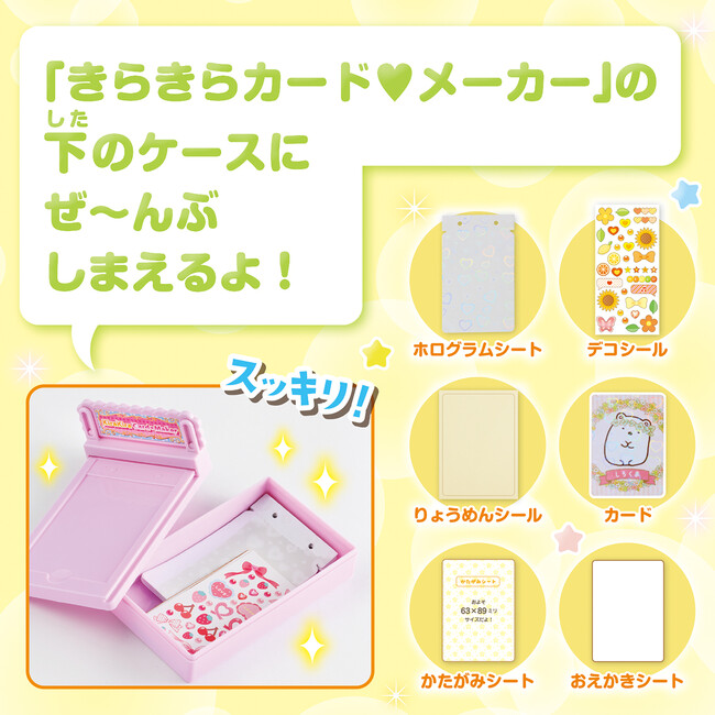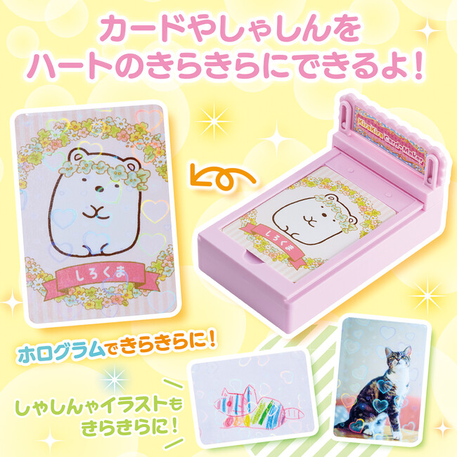 付録のカードや好きな写真を、ハートがきらめくホログラム加工できる「きらきらカードメーカー」が付録。カードをセットし、ハートの「ホログラムシート」をのせてレバーをひくだけで、「きらきらカード」が作れます。付録の「りょうめんシール」もセットすれば、簡単に「きらきらシール」も作れちゃいます!