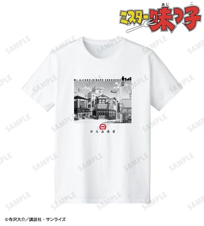 昭和の街並みが残るいなり通り商店街にある、日之出食堂の全景をメインにデザインしたTシャツと、味吉陽一がライバルたちとの味勝負を受けて立つシーンを使って、勝気な陽一のイメージをデザインしたTシャツです。
