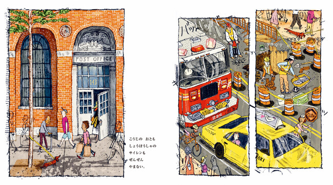 たとえば、ニューヨークは、消防車とかのサイレン音がすごいんです。初めてニューヨークに来た方は、びっくりすると思います。私は日本で救急車を見ると、サイレン音の小ささにいつも驚きます。この右側のページに「バッバッバー」ってありますが、なんでクラクションが鳴ってるかっていうと、前のタクシーがどかないから。私は、どかない車の運転手のところに、消防士がすごい勢いで降りてきて、胸ぐらつかんで…ていうのを2回ほど見たことがあります。そのぐらいよくあることなんです。