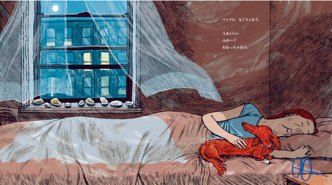 矢野さん: 原文は「ready to leap into a deep ocean sleep」。これは王道の“rhyme”(ライム=ラップの用語で韻を踏むこと)なんですが、私は最初、そのライム訳っていうのを出来もしないのに、ちょっと考えたんです…でも力及ばず。それで、「ベッドに もぐりこもう。 うみくらい ふかーく ねむっちゃおう。」と考えて、結局こちらの方が全然いいということになりました。