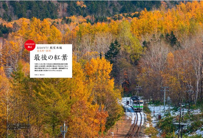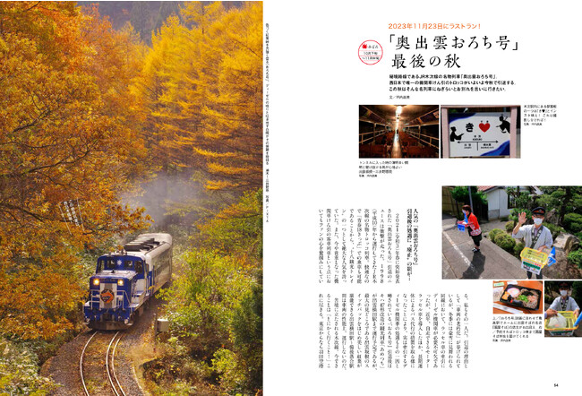 西日本でも有数の紅葉の美しさを見せる奥出雲エリア。そこを縦断するJR木次線を走る観光トロッコ列車「奥出雲おろち号」が11月23日にラストランを迎えます。紅葉に染まった山を三段スイッチバックで走り抜けていく雄姿を目に刻む旅を取り上げています。そのほか、「奥出雲おろち号」同様に、紅葉の美しさを窓のないトロッコ車両から楽しむことができる、トロッコ列車の世界を特集しています。
