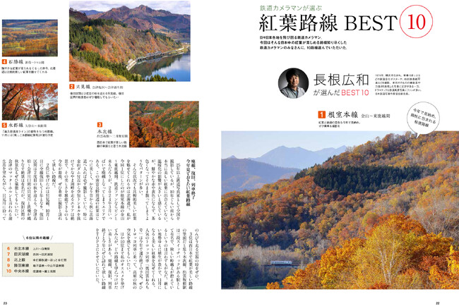 四季の美しい景色の中を走る鉄道の魅力を撮り続けている10人の鉄道カメラマンに、紅葉のおすすめ路線BEST10を選んでいただきました。北から南まで、カメラマンひとりひとりの個性ある選定、紅葉が迫るような写真の数々は必見です。そしてそのランキングを集計し、紅葉路線BEST20として発表しています。