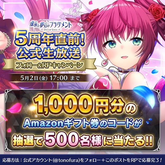『Deep One 虚無と夢幻のフラグメント』の5周年直前生放送を記念して、抽選で1000円分のAmazonギフトカード番号が500名様に当たるキャンペーンを開催いたします!