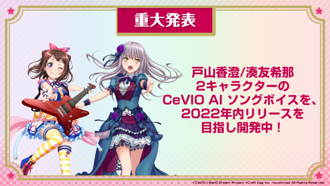 Poppin'Partyの戸山香澄(CV.愛美)とRoseliaの湊友希那(CV.相羽あいな)のソングボイスを開発予定です。