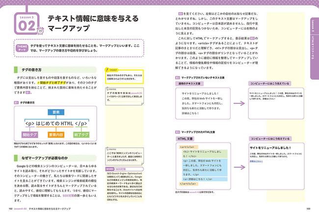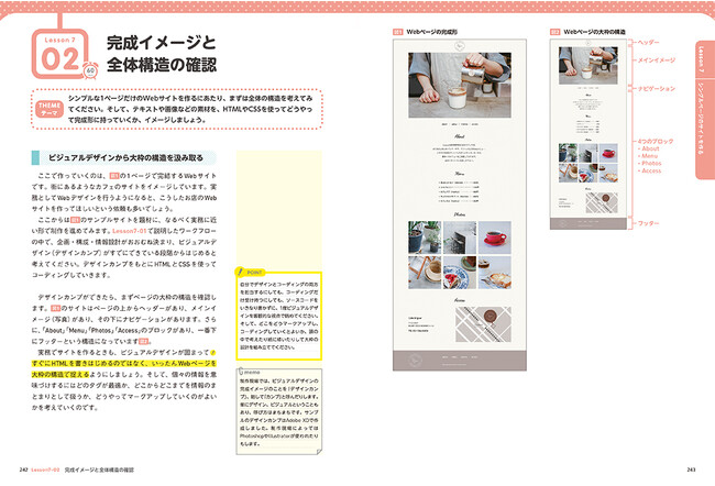 実践パートで学習用サンプルとして制作するのは、シングルページのシンプルなお店のサイトと、レスポンシブWebデザインを取り入れたサイトの2つです。手順に沿ってやってみるチャレンジパートもあるほか、学習用サンプルはダウンロードデータとして提供。