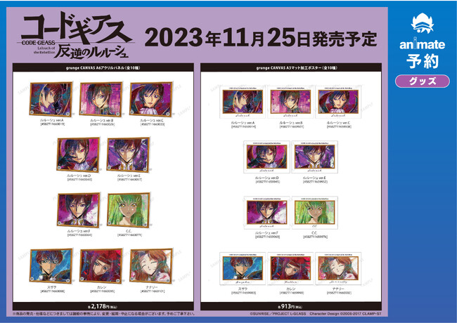 2023年8月24日(木)~2023年9月10日(日)の期間中、アニメイト通販にて『コードギアス 反逆のルルーシュ』の対象キャラクターグッズをご予約1,100円(税込)毎に、通販事前予約キャンペーン限定「ポストカード(全12種)」を1枚プレゼント!