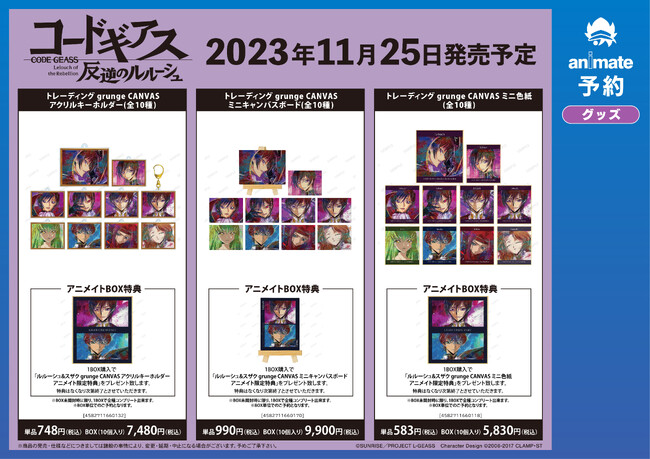 ※11月25日(土)より予約開始予定のECサイト「AMNIBUS」では、BOX購入特典として「ルルーシュ&C.C. grunge CANVAS アクリルネームプレート AMNIBUS限定特典」を予定しております。