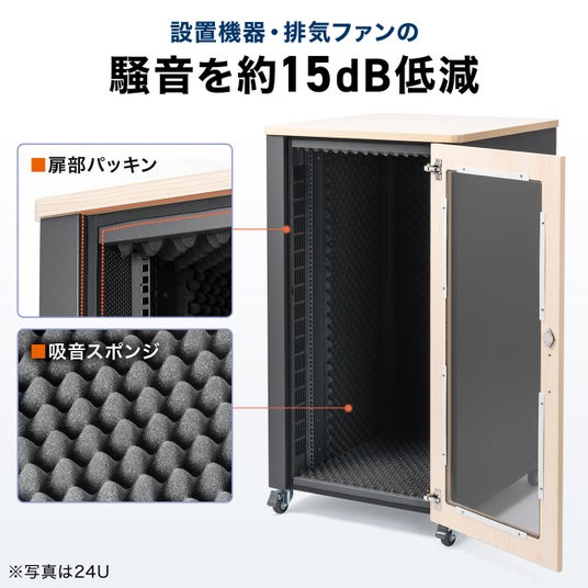 本製品は、ボックス内部の騒音やファンから出る騒音を低減する19インチマウントボックスです。
