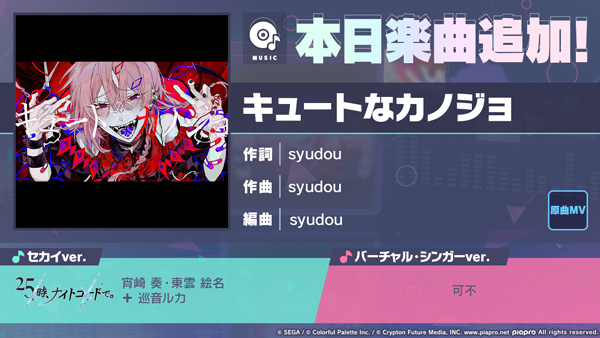 「キュートなカノジョ」(作詞・作曲:syudou)を、『プロジェクトセカイ』の新たなリズムゲーム楽曲として追加いたしました。