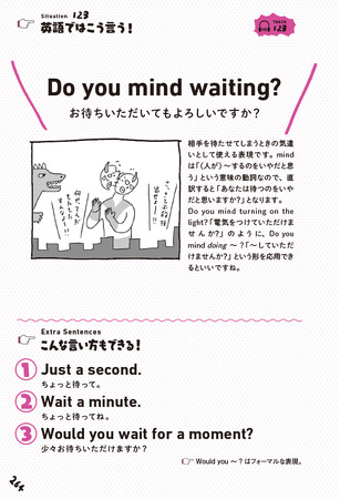 ふふっと笑ってしまうイラストなので、笑いながら基本的な英会話フレーズを覚えられます。収録している英会話フレーズも、基本的ながらいざという時にパッと英語で伝えるのが難しいものを厳選しています。このイラストなら絶対に楽しく学び続けられるはず!