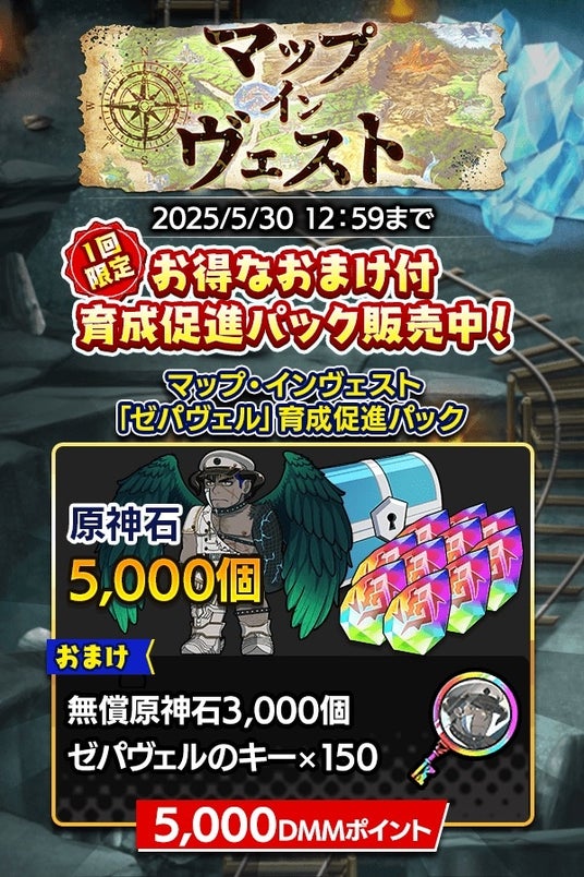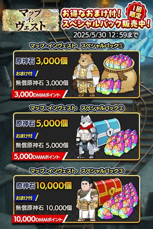 「マップ・インヴェスト」開催、「ゼパヴェル」の登場を記念して原神石に加え、育成素材が入手できてお得な「マップ・インヴェスト「ゼパヴェル」育成促進パック」と、スペシャルパックも3種登場!こちらも是非お見逃しなく!