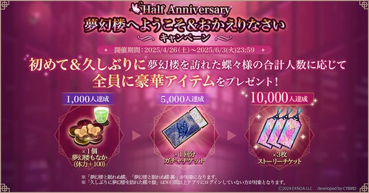 DMM GAMESを運営する合同会社EXNOA(本社:東京都港区、CEO:村中 悠介、URL:https://games.dmm.com/)は、オトナの女性向け恋愛ゲーム「夢幻楼と眠れぬ蝶」にて、2025年5月19日(月)のハーフアニバーサリーを記念したキャンペーンの開催をお知らせいたします。