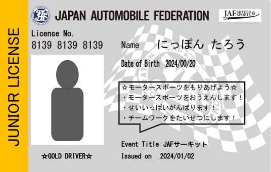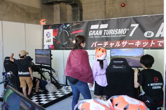 イベント会場にはJAFブースを出展し、本物の競技ライセンスそっくりな写真入りカード「ジュニアライセンス」の発行や、当日会場で観戦しているそのものをeスポーツでバーチャル体験ができる「eモータースポーツタイムトライアル」、紙製モータースポーツヘルメットの配布などをおこないます。
