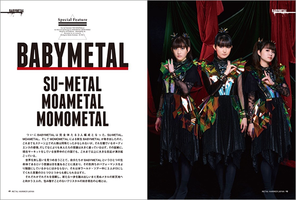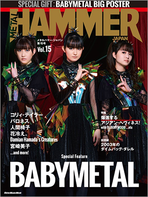 英国の老舗ヘヴィメタル雑誌『METAL HAMMER』の日本版となる『METAL HAMMER JAPAN』は、欧米の最新トレンドと日本独自記事を融合させた、ハイブリッドなメタル&ラウド・ミュージック総合誌。Vol.15となる最新号では、ついに3人体制へと戻った"新生BABYMETAL"が登場! これまでも本誌表紙となってきた彼女たちですが、3名での登場は今回が初となります。SU-METAL、MOAMETAL、MOMOMETALが、ワールド・ツアー中に最新の声を届けてくれました。