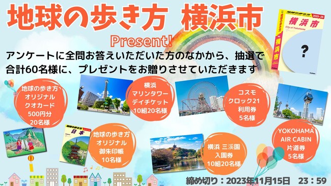 日本の市区町村で最も多い人口である377万人が暮らす横浜市。横浜市民の声を広く集めて、本作りに活かします。2023年10月18日(水)より、「地球の歩き方」の顔ともいえる表紙イラストのシーン案やおすすめスポットなどの市民参加型アンケートの募集を実施。ご協力いただいた方の中から抽選で60名の方に、旅や横浜にまつわるすてきなプレゼントを贈呈します。ぜひご協力ください!